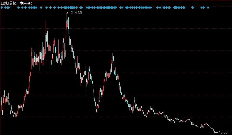 然而,近一年多来,中伟股份的股价节节败退,较高位已是“腰斩”再“腰斩”,近期周线更是6连跌。截止12月19日收盘,中伟股份收涨0.7%,股价报于44.3元,总市值为296.7亿,较高点缩水了千亿。
