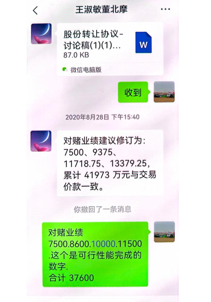 张禹多次向时代周报记者确认,对赌协议上的签名为王淑敏亲笔签署,“这可以去做笔迹鉴定。”他还提供了王淑敏与阎月亮讨论对赌业绩完成指标的微信聊天记录。