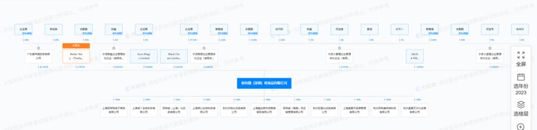 天眼查显示,蜜丝婷在中国的运营主体栢特薇(深圳)化妆品有限公司的实际控制人为广东嘉伟捷投资有限公司,持股42.17%,第二大股东才是泰国蜜丝婷品牌母公司Better Way (Thailand) Co.Ltd,持股27.87%。