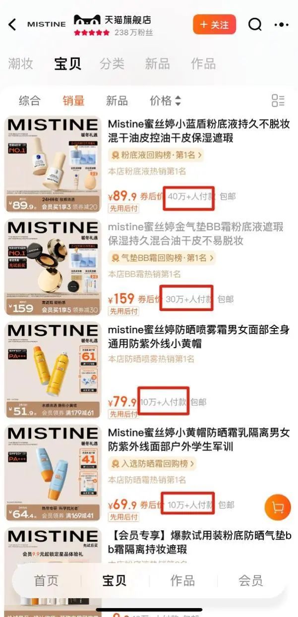 而从蜜丝婷天猫旗舰店数据来看,其彩妆的销量已经远超防晒霜,其中小蓝盾粉底和金气垫销量分别为40万+和30万+,小黄帽防晒霜和防晒喷雾的销量均为10万+。