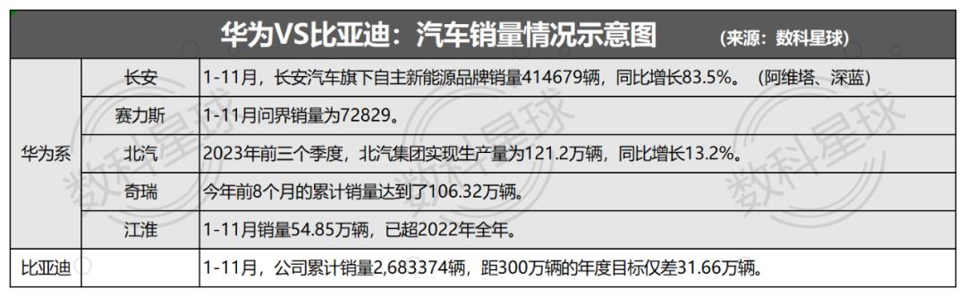 如上图,如果去除华为的几种合作模式(智选车、鸿蒙智驾和零件供应商等)不考虑,那么整体华为系车厂的年销量恰至300万辆附近。这一点,几乎与比亚迪持平。