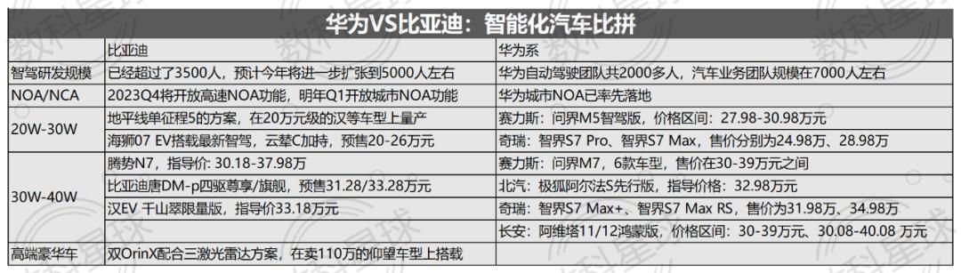 表象是,比亚迪的优势在与其巨大的销量/产能、千亿现金储备、10万+工程师资源和在电动化领域完整的产业链资源。对比之下,华为的优势则是,2023年下半年其Mate60带来的流量效应,以及智界S7、问界M7的示范效应,让华为系品牌异军突起,抢得了大块蛋糕。