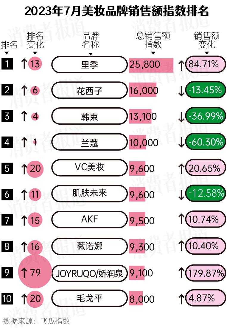 蝉妈妈平台显示,里季在近一年内销量显著增长,于今年7月栖身抖音美妆榜单Top5,为近半年来首次上榜。根据《2023年7月美妆抖品牌里季、VC美妆、娇润泉社媒营销电商分析报告》综合直播销售、自然销售等各项数据,在兰蔻、薇诺娜众多品牌当月销售额指数里季排名第一。虽然上榜一次之后很快跌下前20,但根据统计数据,里季近半年贡献破亿销售额,销量超100万件。
