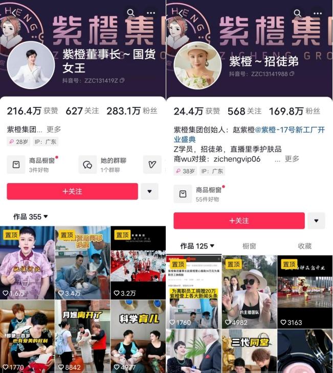 声称自2010年开始从事护肤品研发工作赵紫橙则依靠打造“女强人”人设吸粉,在视频中,其个人形象是一个有4个孩子,经历过婚姻、事业变故,但始终积极向上、经常做公益,年近40岁的“女强人”。她时常出现在抖音视频里,分享情感、生活鸡汤,账号中充斥着双胞胎孩子的育儿故事、带娃日常,并持续进行直播带货。“精准内容”触达并吸引了一批三四线城市“妈妈”群体的信任和追随。