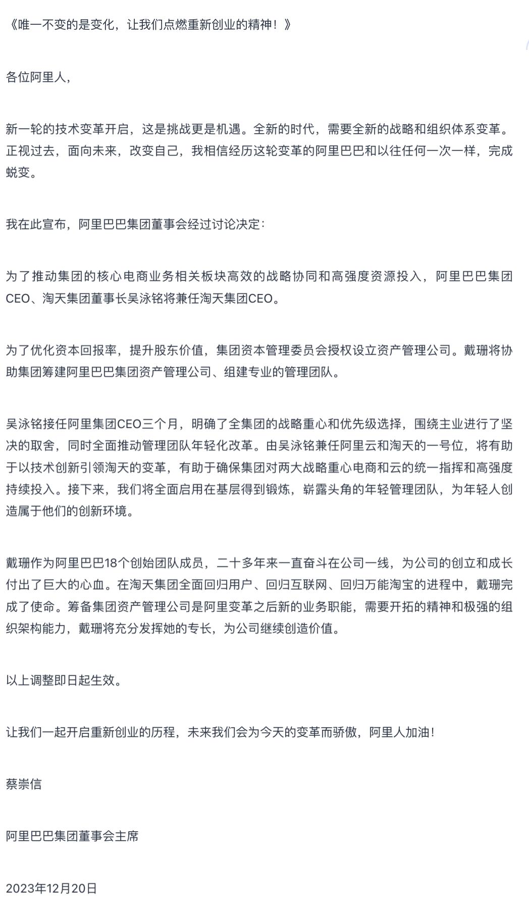 12月20日,阿里巴巴宣布,阿里巴巴集团CEO、淘天集团董事长吴泳铭兼任淘天集团CEO。自此,吴泳铭将同时担任阿里巴巴集团和淘天集团、阿里云智能集团三项CEO职务。