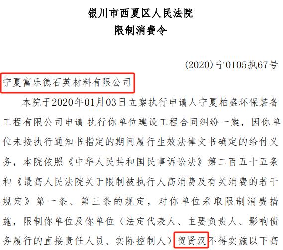 此外企查查显示,银川市西夏区人民法院在2020年对宁夏富乐德石英材料有限公司(下称“宁夏富乐德”)及贺贤汉限制消费。原因为,该法院于2020年1月立案执行申请人宁夏柏盛环保装备工程有限公司申请执行宁夏富乐德建设工程合同纠纷一案,宁夏富乐德未按执行通知书指定的期间履行生效法律文书确定的给付义务。