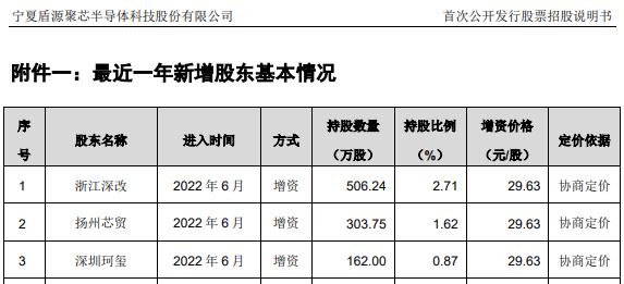 一是突击入股。盾源聚芯为2023年6月获得深交所创业板IPO受理,其2022年6月通过增资的方式引进外部投资者。盾源聚芯申报稿显示,被列为最近一年新增股东的共有15名。资料显示,突击入股主要是指拟上市公司在上市申报材料前的1年内,有机构或者个人通过增资或受让等方式成为公司新股东的情形。所以盾源聚芯存在突击入股。