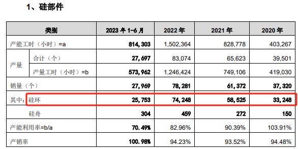 申报稿显示,盾源聚芯硅部件主要由硅环和硅舟组成。2020年至2022年,盾源聚芯硅环的销量连续增长,分别为3.32万个、5.85万个、7.42万个。2023年上半年,盾源聚芯硅环的销量为2.58万个,由于数据缺失,所以不太好判断具体的同比情况。
