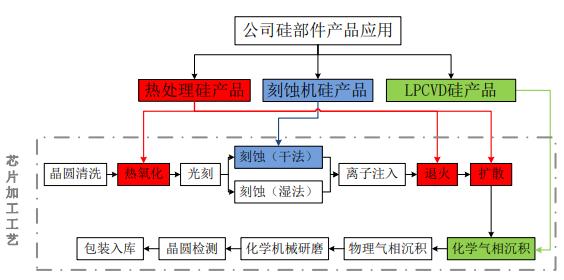 其中,盾源聚芯硅部件产品在芯片加工流程里主要用于热氧化、刻蚀(干法)、退火、扩散、化学气相沉积。