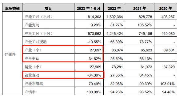 但回复函显示,盾源聚芯硅部件2023年上半年产量为2.77万个,同比下降34.62%;其销量为2.8万个,同比下降34.3%。那么,盾源聚芯硅环2023年上半年销量下降多少,值得关注。