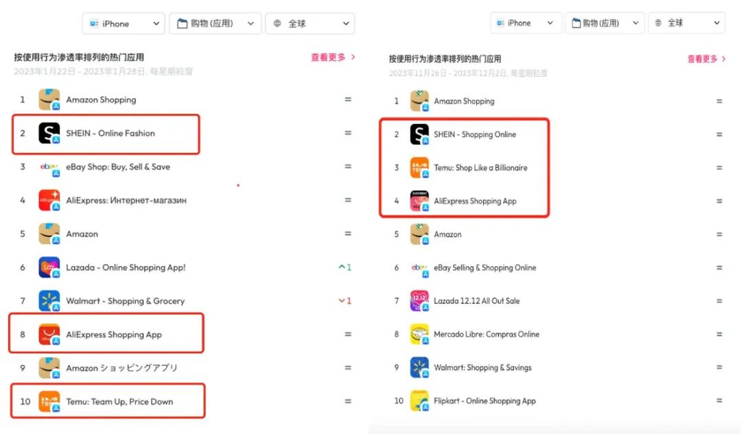 根据data.ai发布的2023年11月19日-25日iOS全球购物类App使用行为渗透率排名,亚马逊位列第一,紧跟在它后面的,是SHEIN、TEMU和速卖通。而在今年1月的同一张榜单上,这三家中国公司排名分别是第2、第10和第8。