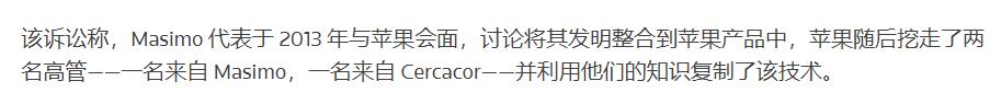 Masimo表示,在离结束讨论会议时,苹果公司感觉这些会议很有成效,但随后的举措却是开始从Masimo及其分拆公司Cercacor招聘关键员工,从某种意义上也是一种「为了获取信息和专业知识的有针对性的努力」。