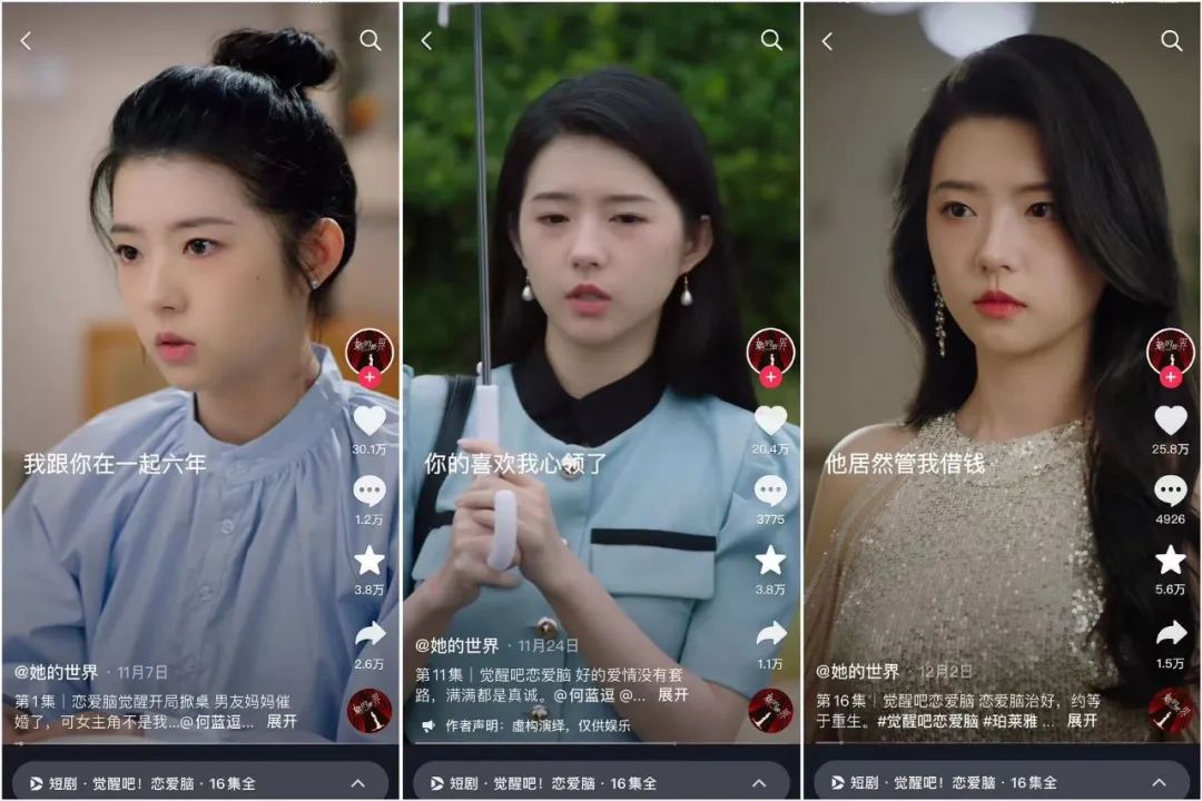 可以看到,在女性独立意识不断崛起的当下,越来越多的女性更加关注自身的成长和自我价值的实现,不再沉溺于单纯的男女情爱中,短剧作品也紧跟这一“潮流”,增加了这方面的着墨。