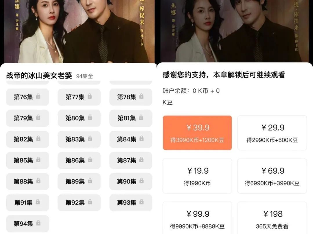 同样值得关注的是,根据卡思观察,目前一集短剧的平均价格在1-2元之间,看上去价格便宜,但因为时长短,集数相当多,想要追完一部剧,花费上百元是常态。这个价格甚至超过了部分视频平台包年会员的价格,性价比显然不高,未来当观众们逐渐“反应”过来,这样的收费水平想必难以维持。