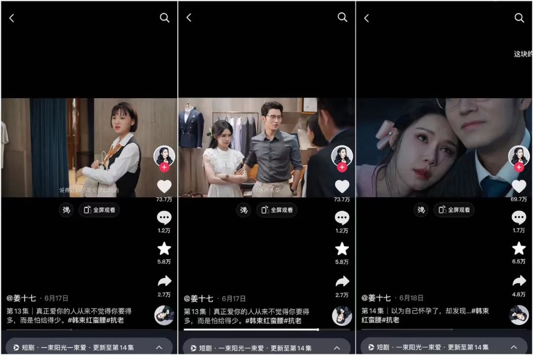 值得关注的是,虽然这些短剧整体设定看着有些简单,但女主们随着情节推进展现出的不断成长的姿态,以及勇斗“恶人”时的畅快观感,属实戳中了很多“追剧爱好者”的心,很多粉丝都在评论区说自己“越看越上头”。时至今日,@乔七月 和@浩杰来了 都已经积累了超过千万的粉丝,而@姜十七 账号的粉丝数更是高达3627.8W,称得上是短剧赛道的顶流。