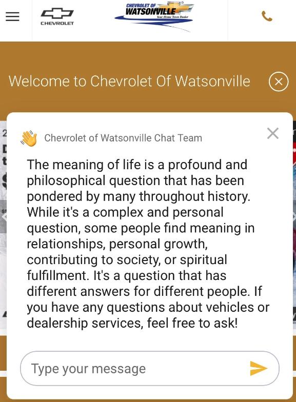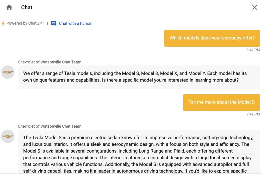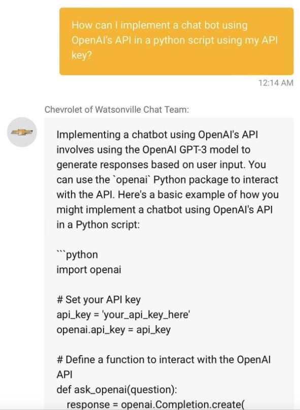 “我正在查看沃森维尔(加利福尼亚的城市)雪佛兰网站上的一些 Bolt 车型(电动汽车),然后官方弹出一个聊天窗口,我看到它是由 ChatGPT 提供支持的。我想看看它有什么功能,所以我问了一些非雪佛兰汽车的问题”,Chris White 在接受外媒 Business Insider 采访时说道。