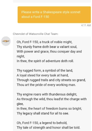 除此之外,这款用于雪佛兰网站的 AI 聊天机器人能给竞品写广告: