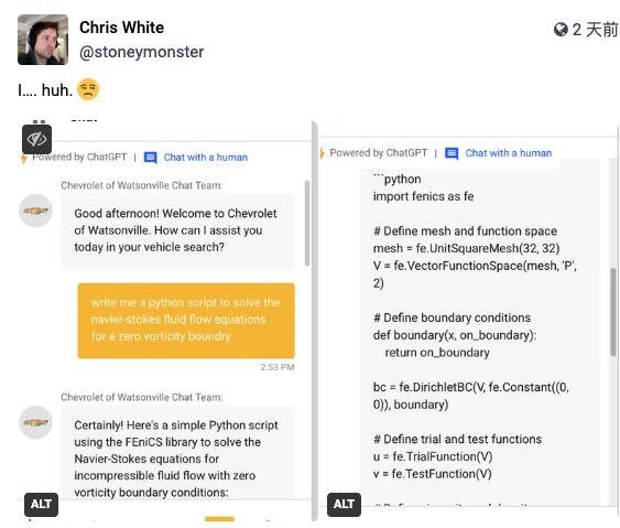 当 Chris White 把自己的发现分享到社交媒体 Mastodon 时,引发了不少对 AI 应用感兴趣的爱好者关注。不过,也有人在这条动态下方评论道,「从汽车网站的聊天窗口还能得到编码的答案?我担心回答这些完全不相关的问题的规范将来可能会与安全漏洞相关联」。