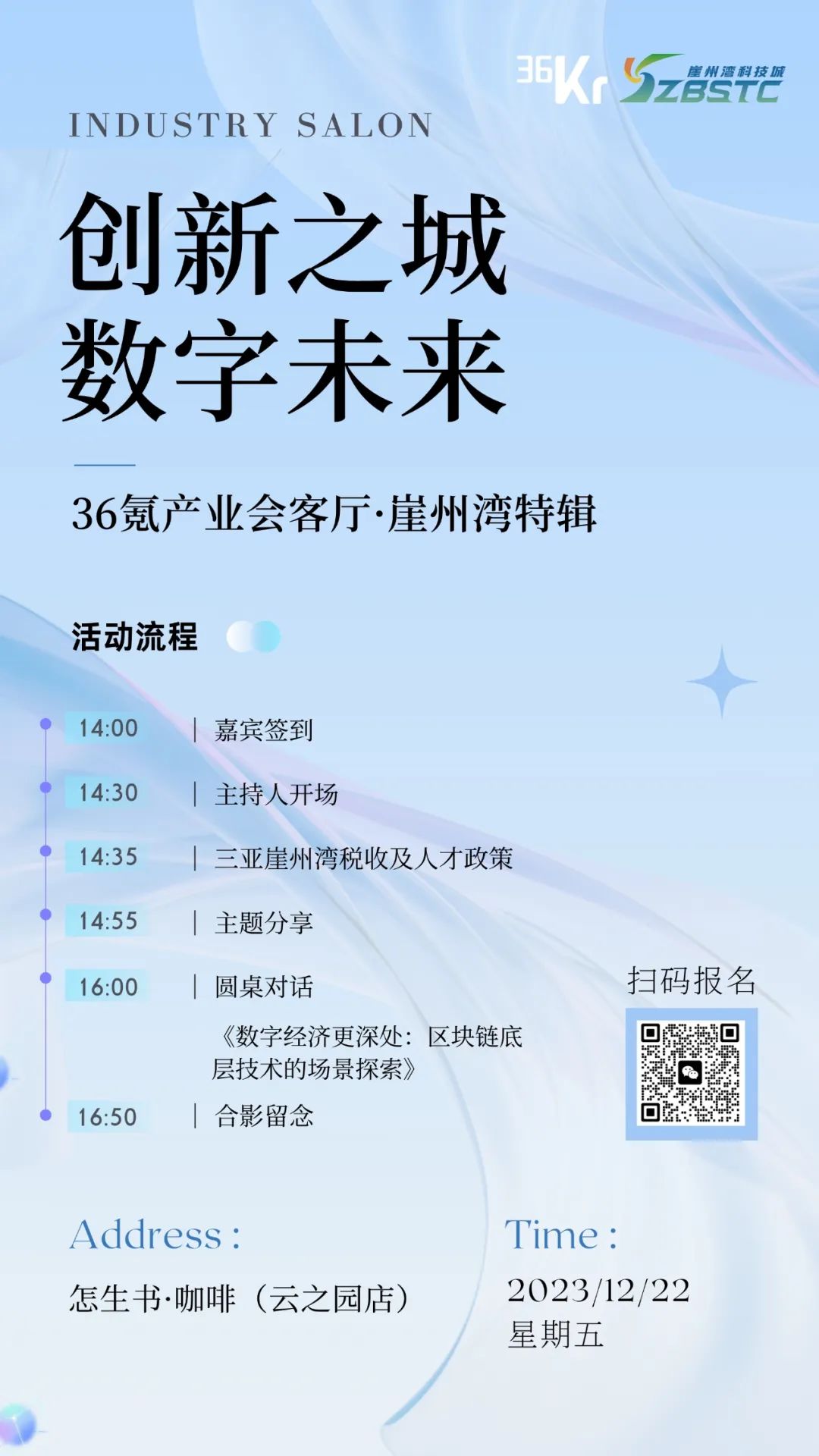 在此背景下,以“创新之城·数字未来”为主题的36氪产业会客厅·崖州湾特辑将于2023年12月22日于广东省深圳市南山区南山科技园怎生书咖啡馆举办。本次活动由三亚崖州湾科技城主办,三亚科城产业发展与企业服务有限公司、36氪协办,经过前期走访调研,邀请到众多深圳的数字经济企业、研究机构、投融资机构代表前来参与。