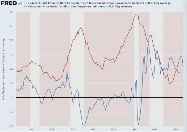 伯恩斯从1970年开始担任美联储主席,他在1972-1974年期间大幅提高政策利率,1975年,通胀率已从12.5%的高位降至5.6%。