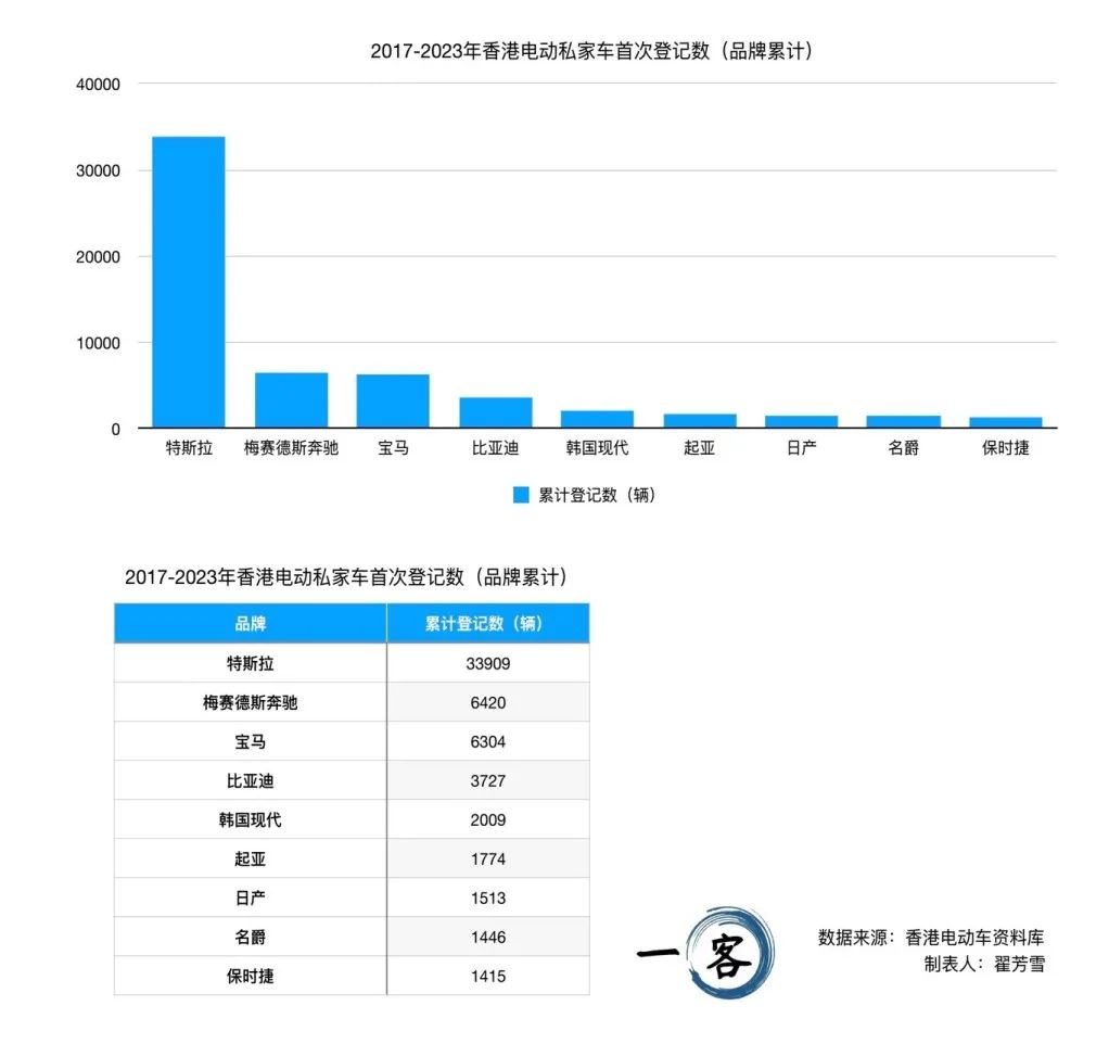 作为对比,第二名的梅赛德斯奔驰只有6420辆,不到特斯拉的五分之一。而中国内地的新能源销冠比亚迪,在香港的首次登记数只有3727辆,总占比不到6%。