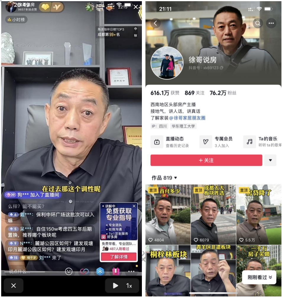 比如,重庆的一位房产创作者小川说房,通过直播和房产内容的生产,让人们认识到他在房产方面的专业性,让很多用户在见到他本人之前已经有了很好的信任基础,在抖音上和他咨询各种各样的购房事宜。