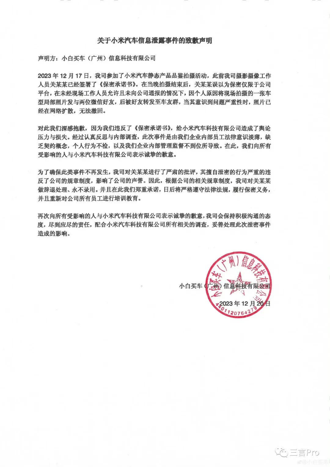 继ZAKER致歉后,“小白买车”也发布致歉声明,称摄像工作人员关某某拍摄结束后,误以为保密仅限于公司平台,因个人原因将拍摄的一张车型局部照片发与两位微信好友,后被好友转发到了车友群,意识到问题严重性时,照片已经在网络扩散,无法撤回。