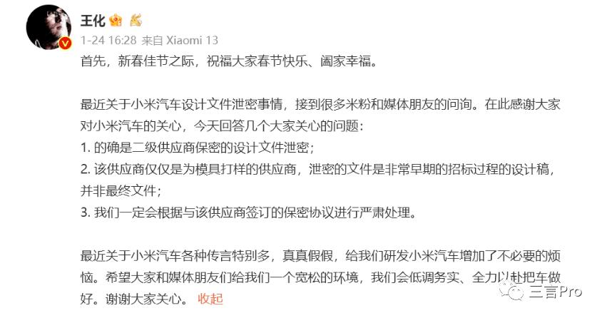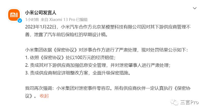 2月2日,@小米公司发言人 通报泄密处理结果:1月22日,小米汽车合作方北京某模塑科技有限公司因对其下游供应商管理不善,泄露了汽车前后保险杠的早期设计稿。