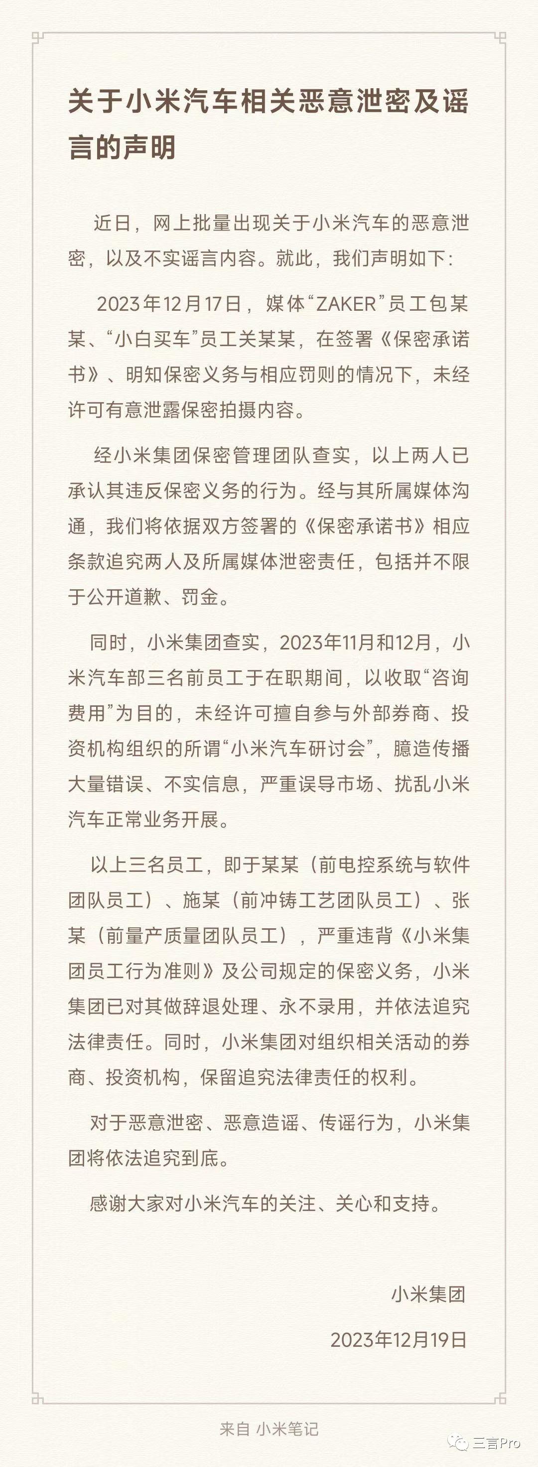 声明指出,2023年12月17日,媒体"ZAKER"员工包某某、"小白买车"员工关某某,在签署《保密承诺书》、明知保密义务与相应罚则的情况下,未经许可有意泄露保密拍摄内容。经小米集团保密管理团队查实,以上两人已承认其违反保密义务的行为。经与其所属媒体沟通,小米集团将依据双方签署的《保密承诺书》相应条款追究两人及所属媒体泄密责任,包括并不限于公开道歉、罚金。