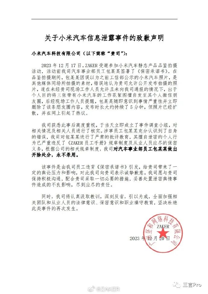 对此,ZAKER今日发布致歉声明称,在品鉴拍摄期间,涉事员工包某某错误地认为小米公司允许公开发布拍摄的照片,出于个人目的将三张带有小米汽车的工作花絮图擅自发至其个人微信朋友圈,后经现场工作人员提醒,包某某随即意识到事情严重性并立即删除了该条朋友圈内容,但照片已经扩散,并在网上引起了热议。
