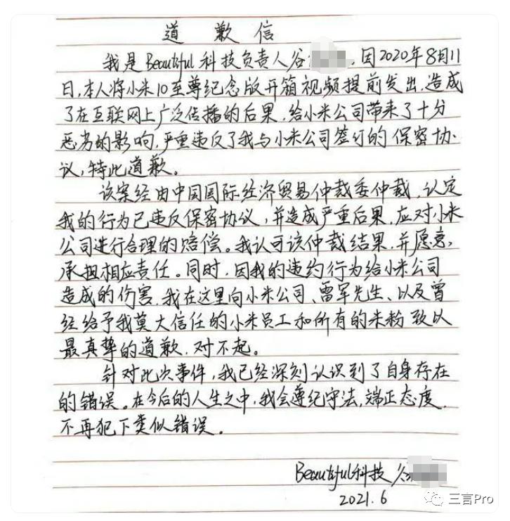 2021年6月24日,Beautiful科技在微博发布道歉信,称其认可该仲裁结果,并愿意承当相应责任。