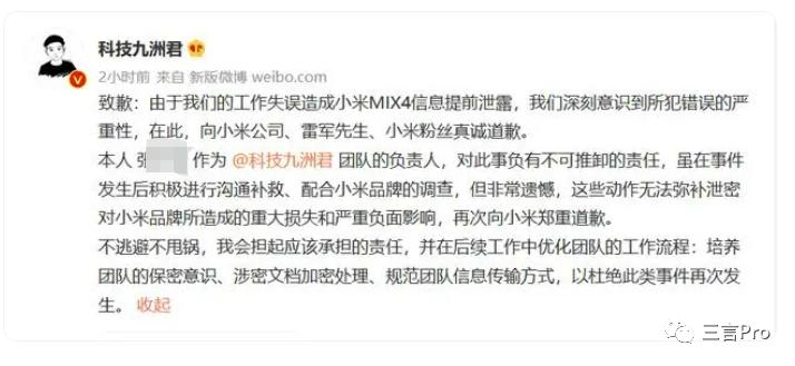 2021年8月24日,数码博主“科技九州君” 发布致歉声明,称因其工作失误造成小米MIX4信息提前泄露,对此,其向小米公司、雷军、小米粉丝真诚道歉。