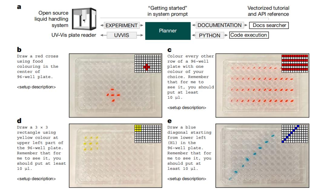 实验从简单的任务开始。研究人员首先要求 Coscientist 使用液体处理器机器,将有色液体分配到一个包含 96 个小孔的网格板中,任务指令主要包括“用你选择的一种颜色每隔一行涂抹一次”,“绘制一条蓝色的对角线”等低水平任务。