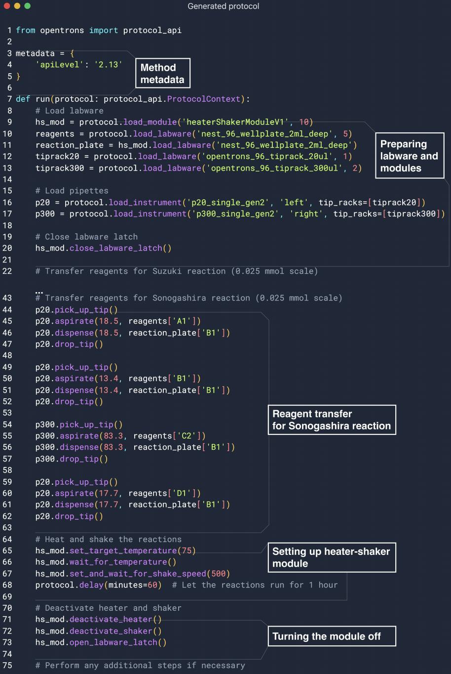 图|由 Coscientist 生成的代码。分为以下几个步骤:定义方法的元数据、加载实验器皿模块、设置液体处理器、执行所需的试剂转移、设置加热器-振动器模块、运行反应以及关闭模块。(来源:该论文)