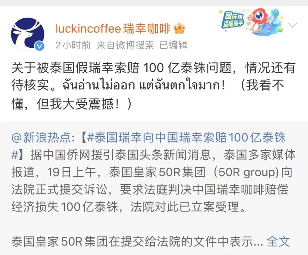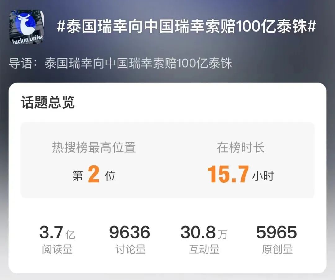 话题是这样的: # 泰国瑞幸向中国瑞幸索赔 100 亿泰铢 #