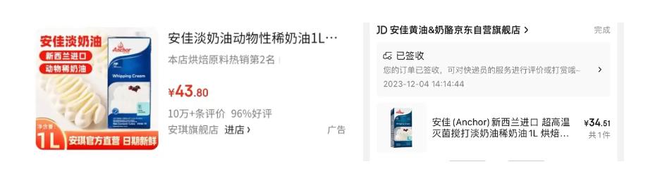 图/麦麦购买的奶油,左为原价,右为购买价 来源/麦麦提供
