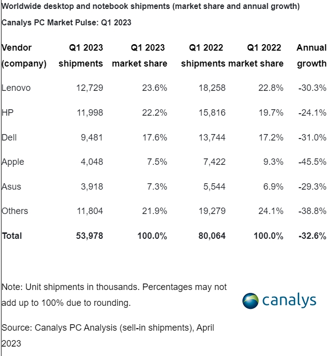 图源:canalys 注:此为桌面PC+笔记本电脑的合计数据,笔记本电脑的相关数据为计算后得出的结果
