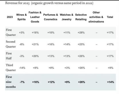 从LVMH集团发布的2023年第三季度财务报表来看,除了丝塔芙所在的精品零售部门依然保持着强劲的增长势头外,其他无论是最知名的皮具箱包板块,还是近两年备受瞩目的手表&珠宝业务,其增速都相较去年同期放缓。具体来看LVMH的葡萄酒和烈酒业务营收增速,从第一季度的3%下滑至第三季度的-14%,降幅远超预期。