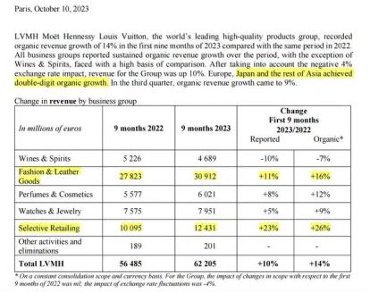 三季报显示,从6月到9月底LVMH的营收增速大幅放缓,从第二季度的同比17%降至第三季度的同比9%。正如预期的那样,该公司主要的增长阻力来自亚洲,这个地区的增长率从34%降至11%。