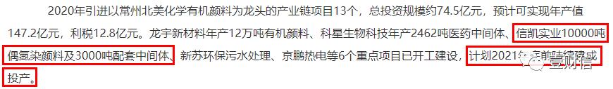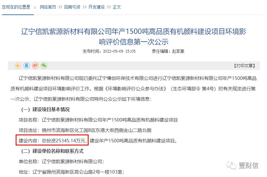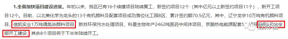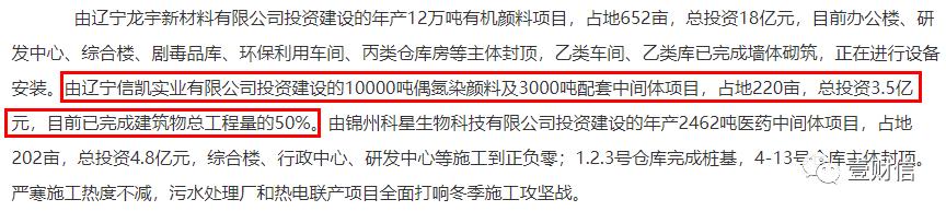 2021年1月,锦州经济技术开发区管理委员会发布消息称:信凯实业10,000吨偶氮染颜料及3,000吨配套中间体项目(下称“偶氮染颜料及中间体项目”)计划2021年底前建成投产;消息还显示,偶氮染颜料及中间体项目占地220亩,彼时已完成建筑物总工程量的50%。