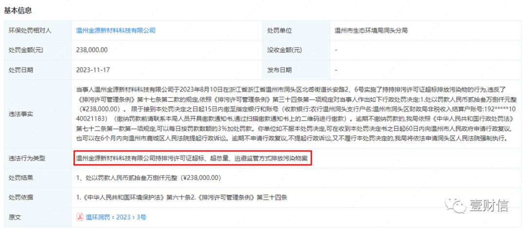 据招股书,信凯科技与温州金源合作已有20年,报告期内采购金额分别为4,684.99万元、5,832.15万元、7,724.21万元和2,244.54万元。据企查查,今年11月17日,温州金源因持排污许可证超标、超总量、逃避监管方式排放污染物被温州市生态环境局洞头分局罚款23.80万元。信凯科技解释该处罚未对其与公司的业务合作产生不利影响,其与公司仍在正常合作。