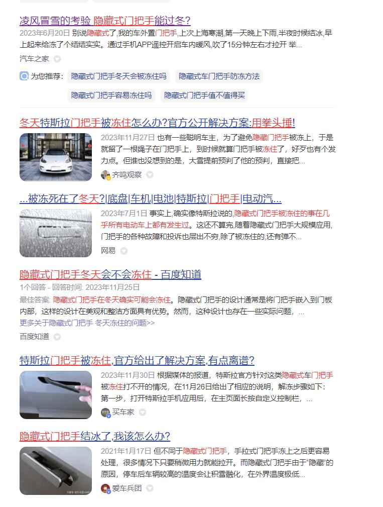 另一个值得注意的问题是,现在新能源车基本上全是隐藏式门把手,但是很多寒冷地区的新能源车主,都曾经经历过,低温冰雪天气,隐藏式门把手被冻住的经历,甚至在网上出现了很多教程,教你这种情况用什么方法开门。