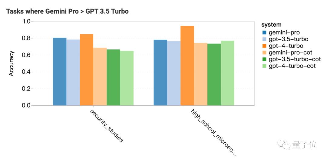 Gemini Pro表现超过GPT-3.5的两个科目是安全研究和高中微观经济学,但差距也不大,团队表示分析不出来什么特别的。