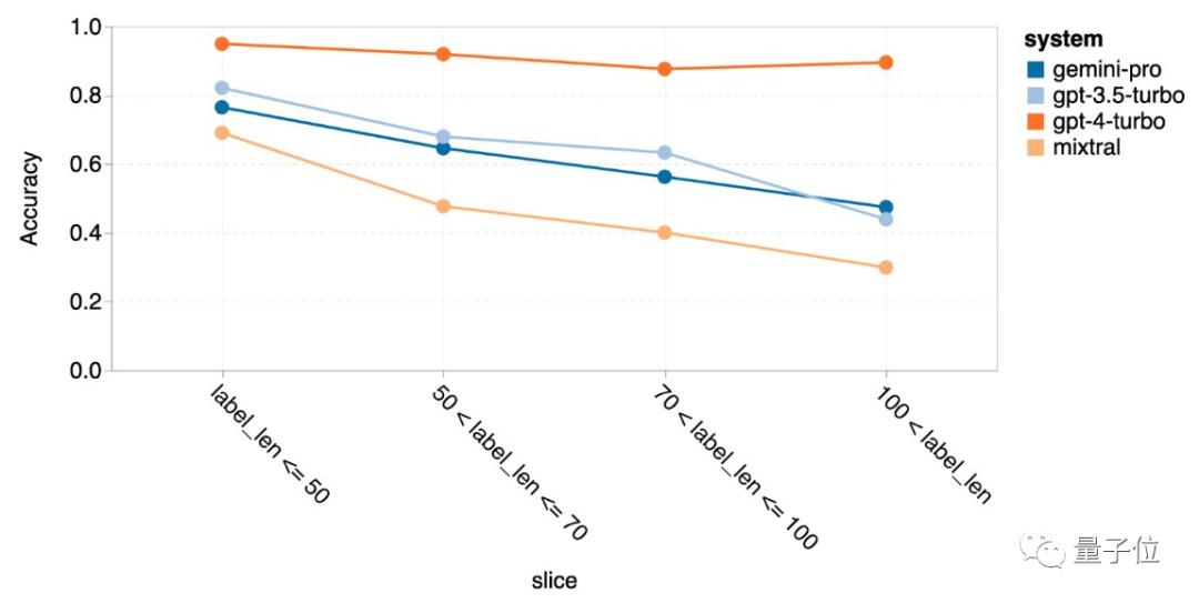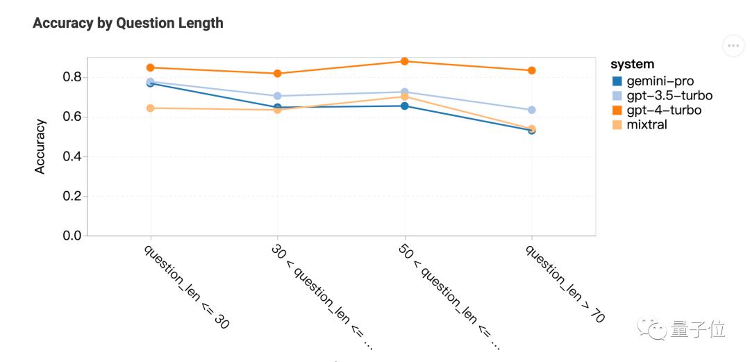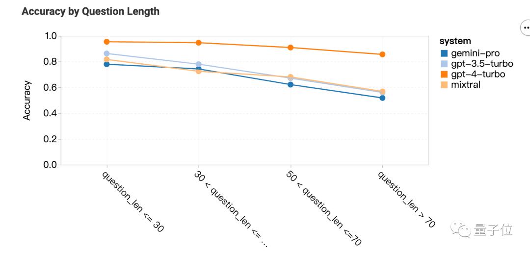 GPT-4 Turbo尤其如此,即使在较长的问题上也几乎没有性能下降,表明它具有理解复杂问题的强大能力。