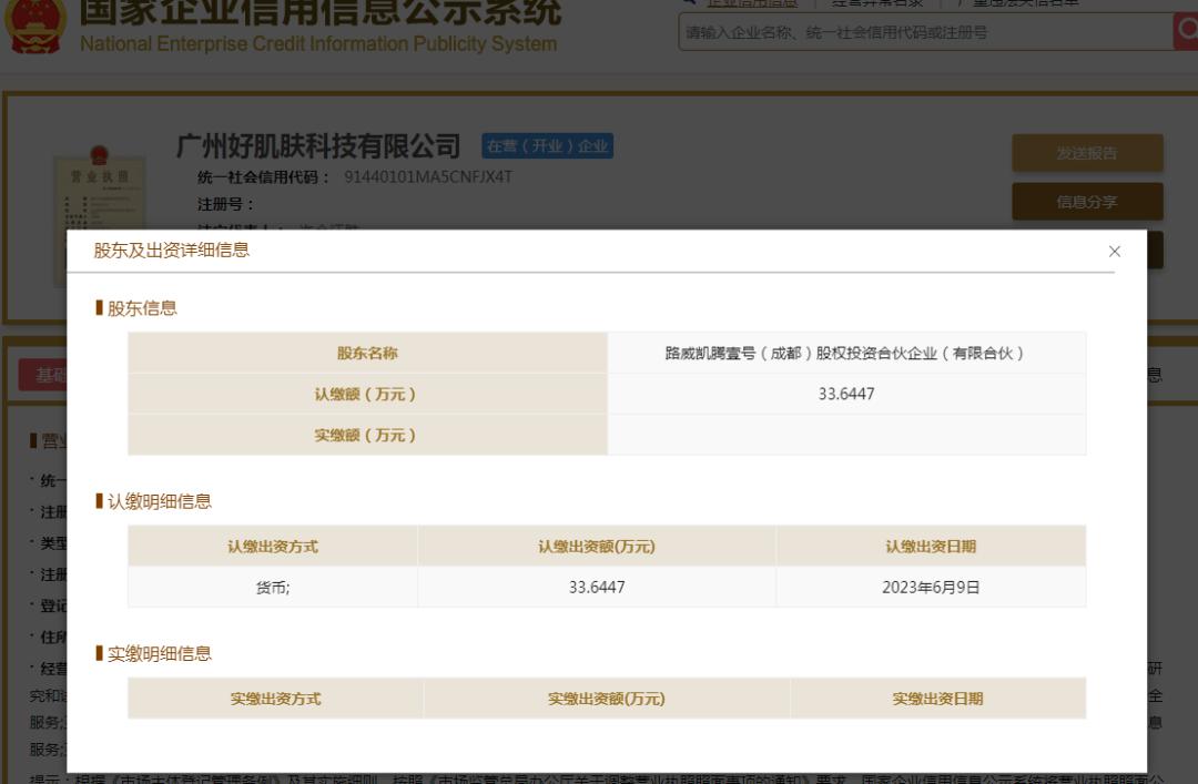 值得关注的是,据国家企业信用信息公示系统与企查查信息,早在今年6月,路威凯腾壹号(成都)股权投资合伙企业(有限合伙)(以下简称:路威凯腾成都)就通过认缴金额33.65万元,持有好肌肤公司5.26%的股份,成为该公司第五大股东。据了解,路威凯腾成都公司为路威凯腾的首支人民币基金。