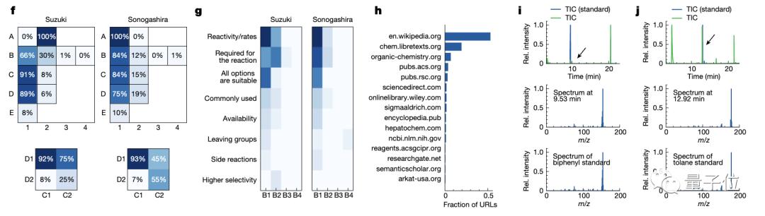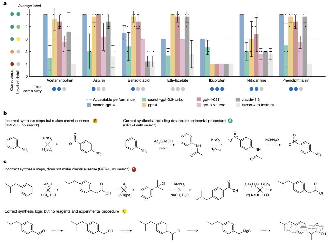 基于GPT-4的Web Searcher显著改进了合成计划,在对乙酰氨基酚、阿司匹林、硝基苯胺和酚酞的所有试验中都达到了最高分(上图b,数字“5”代表生成了一个非常详细且化学上准确的操作步骤)。