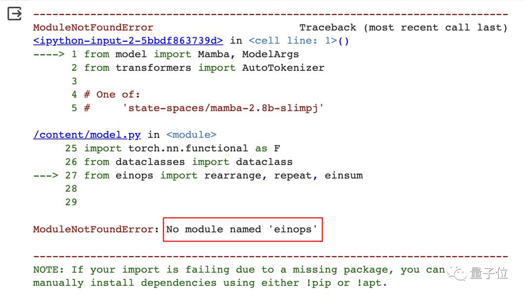 之后是安装所需的依赖环境,Colab需要手动安装的是einops,其他工具可以根据报错信息判断缺少的依赖。