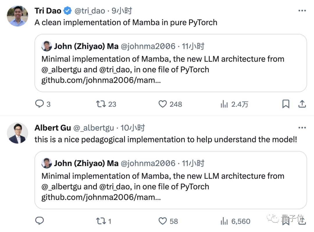 原版Mamba的作者Tri Dao和Albert Gu也转发了这份笔记,并对它的简洁性和易读性给予了肯定。