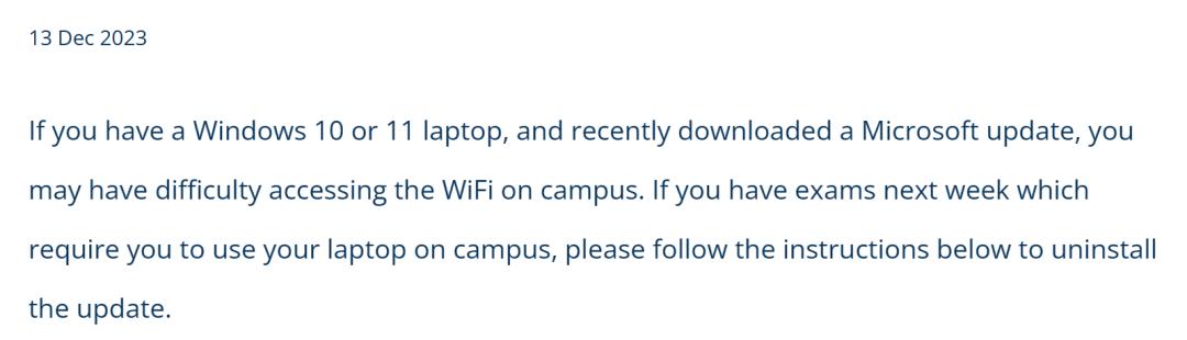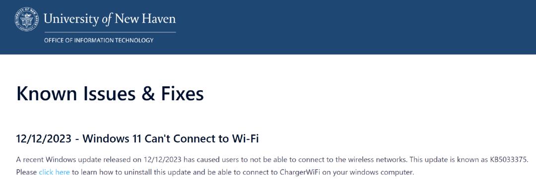 - 纽黑文大学(University of New Haven)警告:“最近于 2023 年 12 月 12 日发布的 Windows 更新 KB5033375,导致用户无法连接到无线网络。”