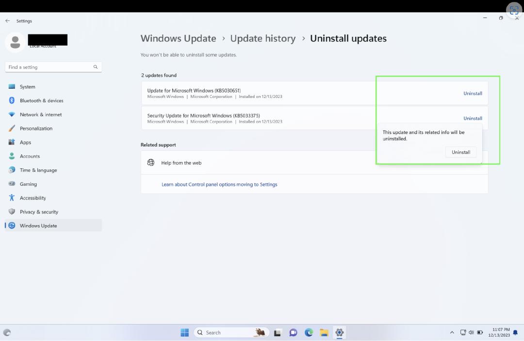 (5)步骤 5:在要卸载的更新旁边单击“卸载”。一般遇到问题,通常最好卸载最近 7 天内的所有更新。